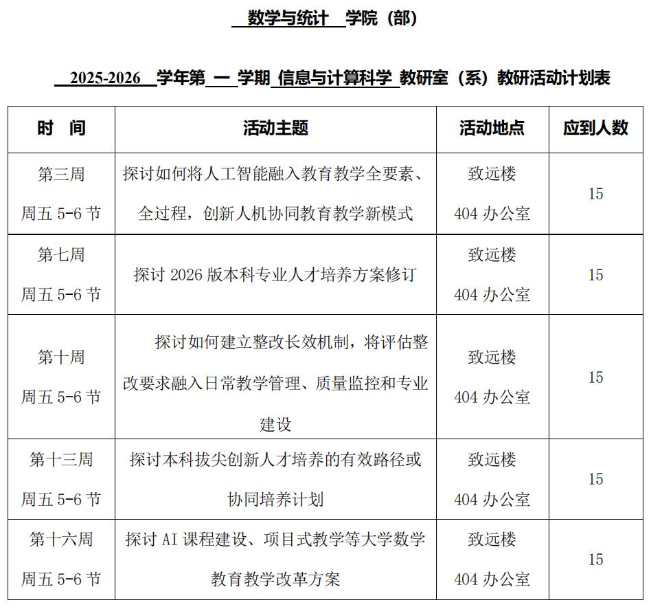 信息与计算科学系2025-2026学年第一学期教研活动安排表